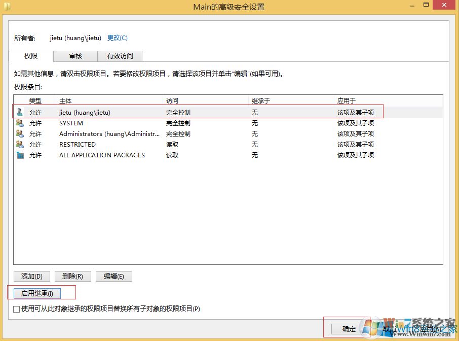3、在出现的“Main权限”对话框界面中,点击高级选项卡,在出现的“Main的高级安全设置”对话框,点击选中“允许”或者要使用IE11的帐户,并点击按钮“启用继承”后,单击底部“确定”按钮即可解决问题,如图所示: