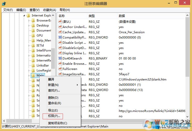 2、调出注册表编辑器窗口后,依次展开HKEY_CURRENT_USER\Software\Microsoft\Internet Explorer\Main,接着选中Main项并点击鼠标右键,选择权限,如图所示: