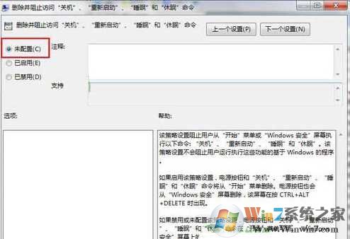 3、在“删除和阻止访问‘关机’命令属性”窗口中,点击“设置”选项卡,选择“未配置”,然后点击“确定”按钮。