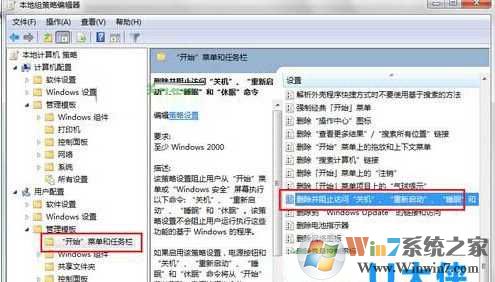 2、“开始”→“运行”,在“运行”对话框中输入“gpedit.msc”,然后点击“确定”按钮。在“本地组策略编辑器”窗口中,点击用“户配置”下的“管理模板”→“「开始」菜单和任务栏”,然后双击右侧的“删除和阻止访问‘关机’命令”。