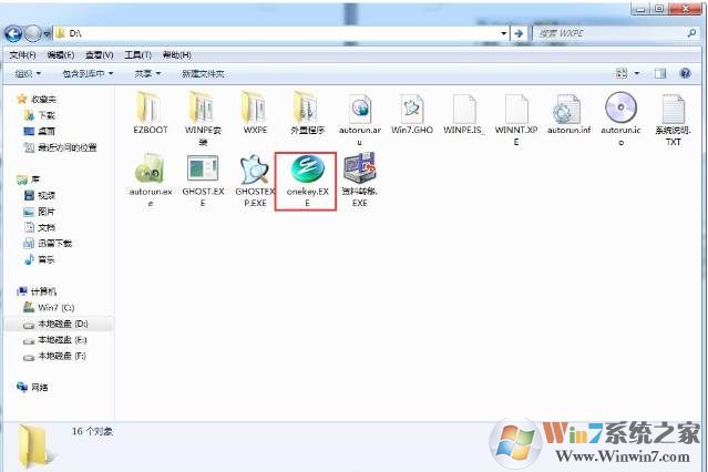 1、将下载的ISO系统镜像文件解压到除C盘(系统盘)外的其他盘根目录,例:(D:),然后右键选择管理员身份运行“onekey.exe硬盘安装器;