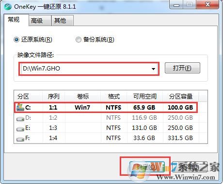 2、选择列表中的系统盘(默认C盘),选择Win7.GHO镜像文件,点击确定。会提示是否重启,点击是,系统将自动安装。