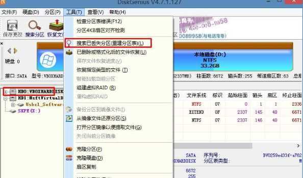 打开diskgenius工具后,选中硬盘,然后点击上面的“工具”——搜索已丢失的分区(重建分区表);