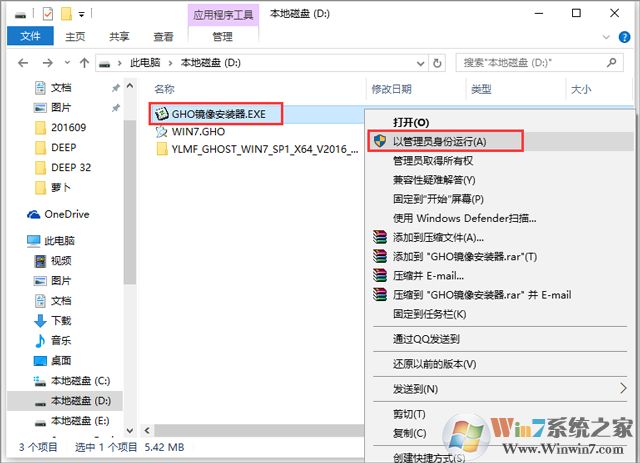 将下载的GHO系统镜像文件放到除系统盘(默认C盘)外的其他盘根目录,例:(D:\),右键以管理员身份运行“GHO镜像安装器.EXE”; (GHO镜像安装器.EXE放在同一目录下);