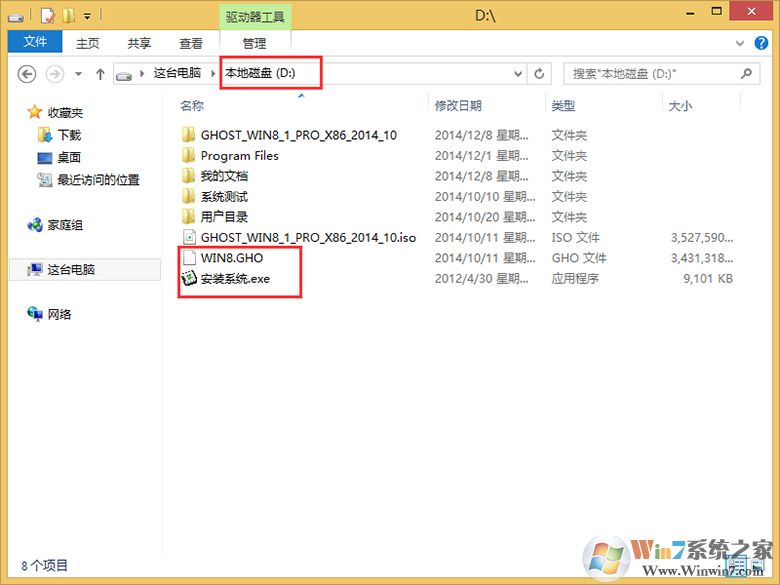 4、把“WIN8.GHO”和“安装系统.exe”两个文件剪切到磁盘根目录下,这里选择放在D盘里;