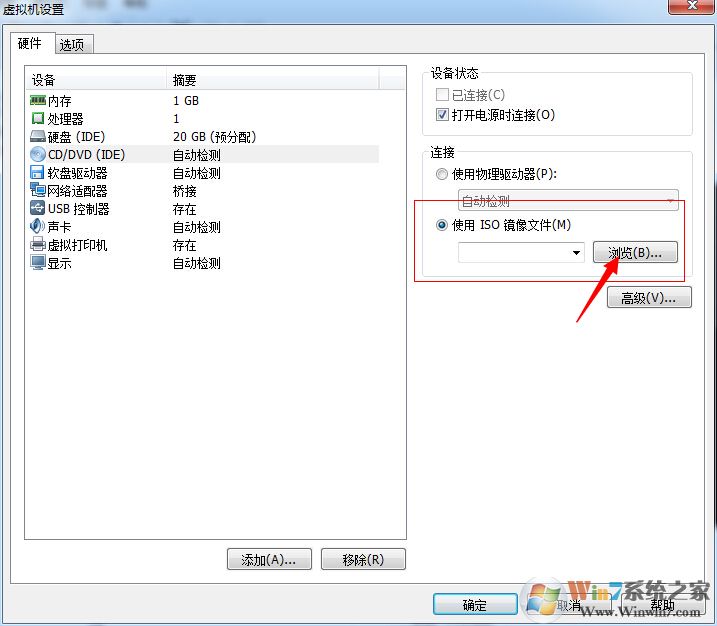 10、虚拟机设置界面左侧鼠标移动点击到CD/DVD(IDE),然后在右侧的链接下选择系统读取的路径,如果你是用光驱+光碟就选“使用物理驱动”,使用下载好的ISO镜像就选下面的“使用ISO镜像”并浏览文件夹选择你下载的XP ISO镜像或Win7镜像。