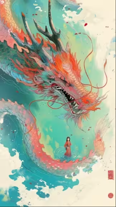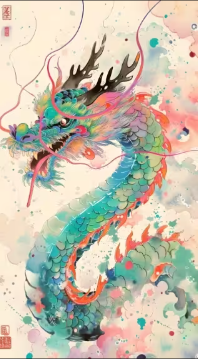 咒语一:中国龙,彩色龙,水墨画,彩画,祥云、超级特写,吴冠中,陈家冷,草间弥生。