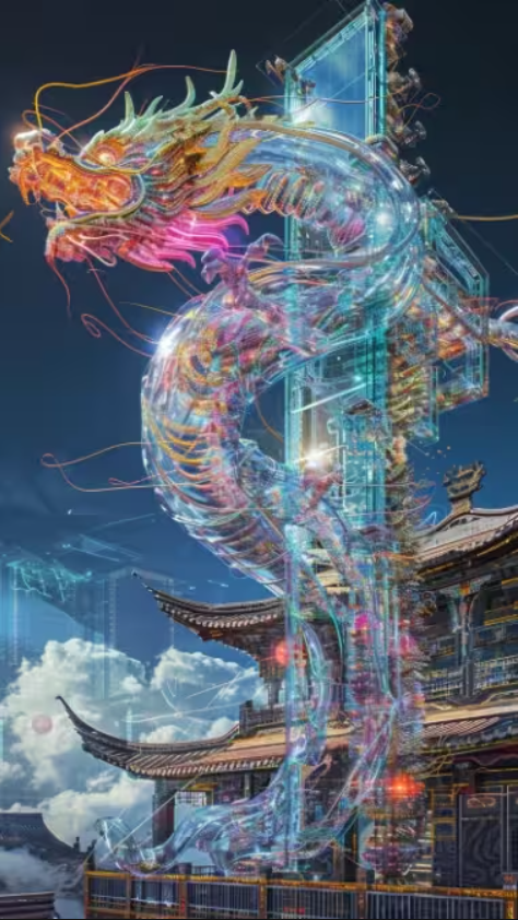 咒语二:中国龙,中国建筑,超现实赛博朋克风格,未来主义数字艺术,环境肖像,虚拟现实空间幻觉,中国龙艺术,故障 艺术,令人神魂颠倒的雕塑,彩色透明亚克力,正面有极其精致复杂的机械结构,x射线透视,过度曝光,xbox 360图形,玻璃雕塑,彩色透明亚克力材料,风格强调解剖,视觉空灵。