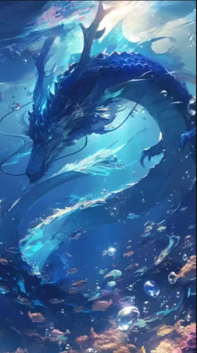咒语四:蓝色透明中国龙,水晶龙角,光芒闪烁,海面飘浮,细节丰富,神秘色调,长焦镜头,逆光,优雅飘动,神秘色调,庄严。