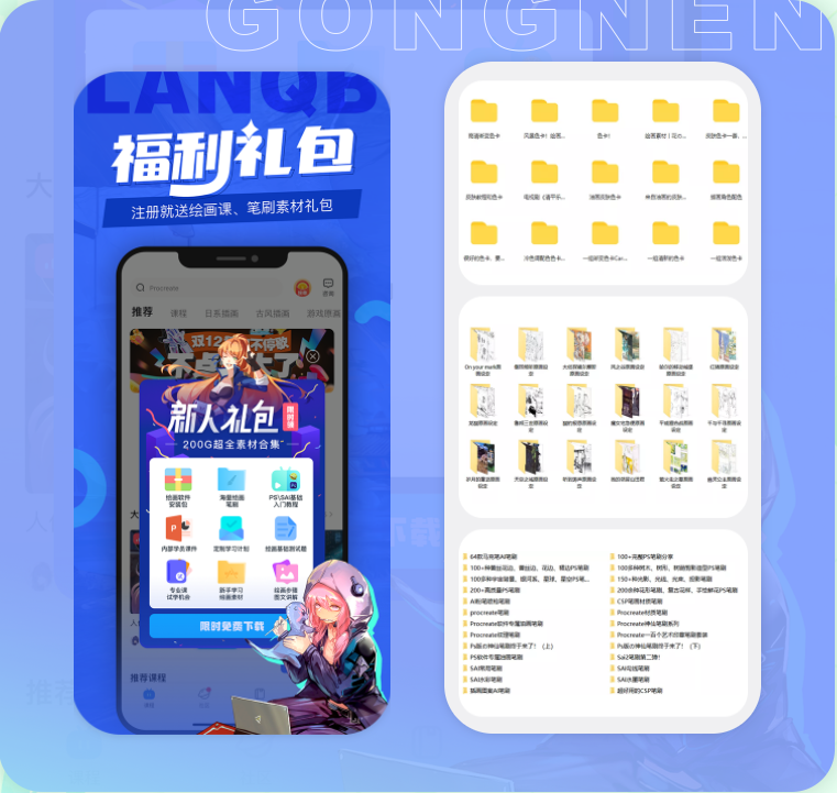 1、福利礼包:下载蓝铅笔APP,注册即可免费领取,绘画基础课及素材笔刷大礼包。