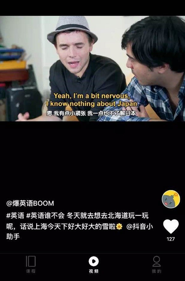 在产品主菜单栏,设有专门的视频入口,视频入口内短视频以与抖音相同的信息流模式呈现,内容均为英语口语学习相关内容。