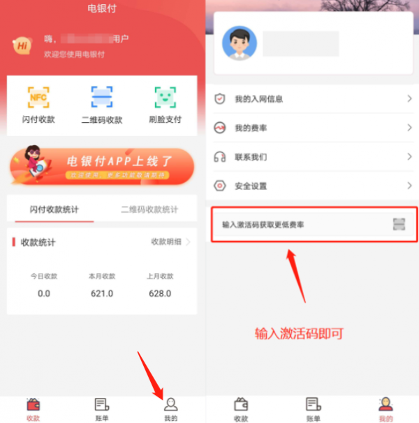 1.电银付APP->我的,点击我的【输入激活码获取更低费率】扫码二维码,点击确定。