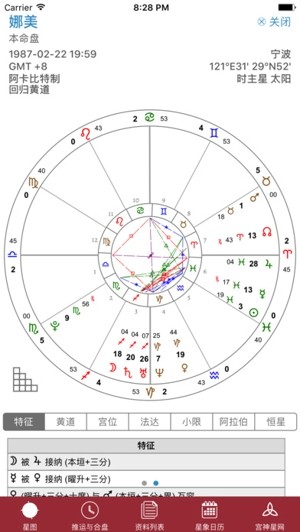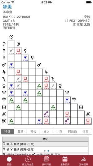 支持本命盘表格:古典特征、黄道状态、宫位、法达星限、小限、阿拉伯点、恒星