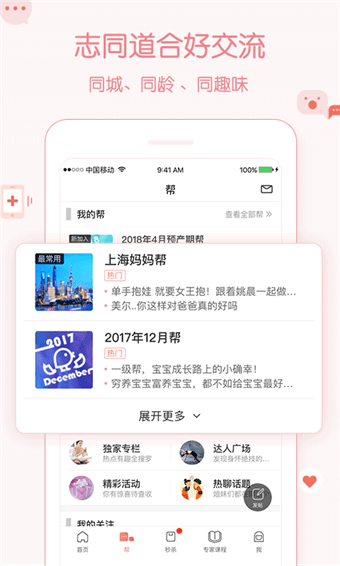 妈妈帮是一个为妈妈群体服务的社区,提供备孕、怀孕、育儿生活交流分享平台,这里有: