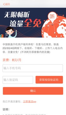 前面说到,用手机听广播是需要网络的,如果流量不够了该怎么办呢?《喜马拉雅FM》为用户准备了“流量包”服务,在2G/3G/4G网络下,在线听、下载听、上传内容全部免 流量,资费为每月8元,不过目前仅限联通用户。