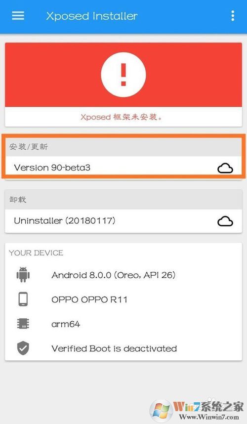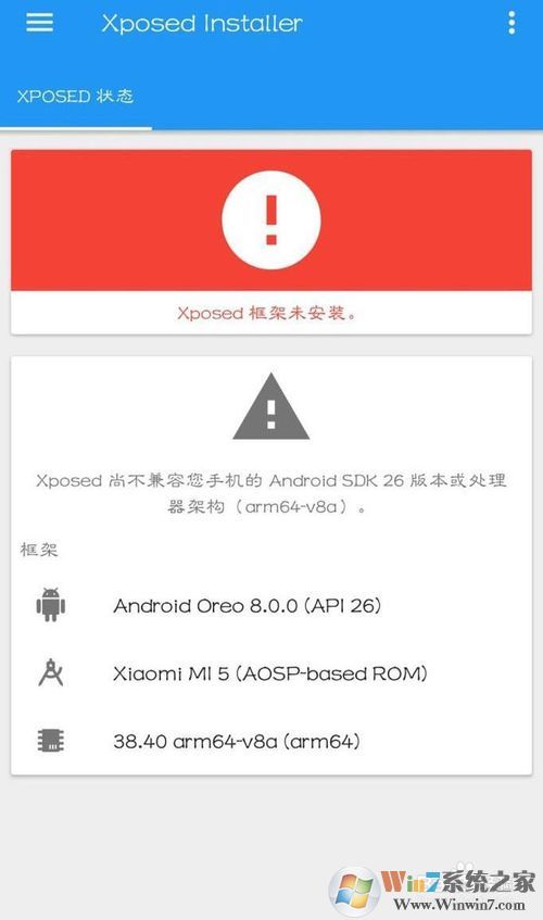 打开后显示红色感叹号,就是未安装XP框架。通俗讲,这个软件只是一个壳子,它只是管理xp框架的工具,xp框架并不是这个软件本身的哈