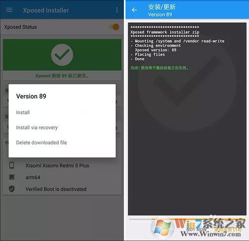 2、接着我们点击安装更新下面那个版本号,就选择安装方式:有root就点第一个,然后就开始自带安装了,过程中手机会关机重启一次到几次不等,然后打开xp installer看看是不是就启用了呢?