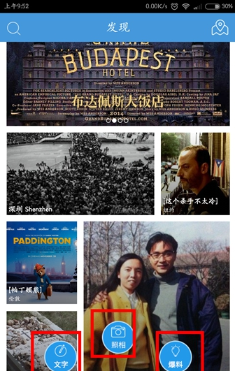 文字指的是发送文字(可选择是否配图),照片是拍摄照片(核心功能:字幕照片和对比式照片),爆料则是指的是贴出一些具有故事和情节的地点和照片,以此引起关注(个人感觉同发现菜单中的内容聚合很相似)。