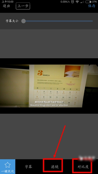 步骤四:添加完字幕后,我们可以选择是否添加滤镜和修改对比度(这两项功能使用得当能大大提高图片美感),完成后点击保存。