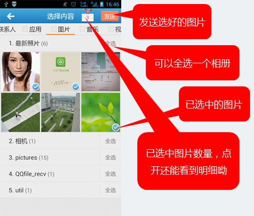 点击选择需要发送的图片,放入上边的礼物箱里,每个类别还有一个全选按钮,方便大家的操作。选完之后点击“发送”。