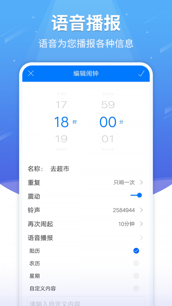 语音闹钟是一款超好用的手机闹铃,这款软件非常智能,可以自定义语音播报内容,也可以手动输入提醒。除了每天早上叫你起床之外,还会提醒你各种节日、纪念日。