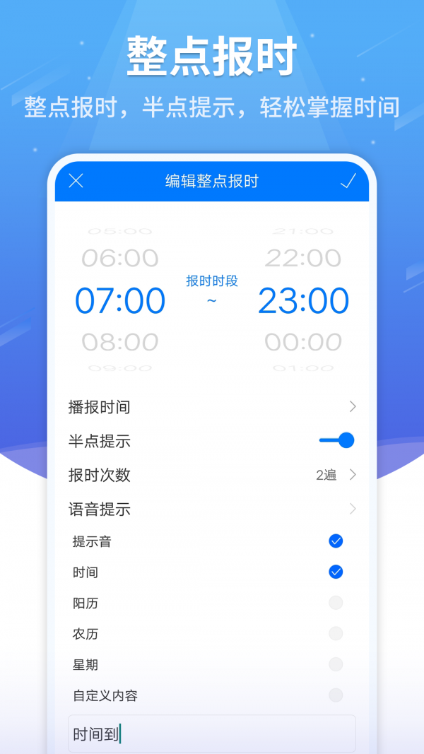 1、语音报时闹钟APP支持整点报时、半点报时、自定义任意时刻报时、间隔无限报时、倒计时。