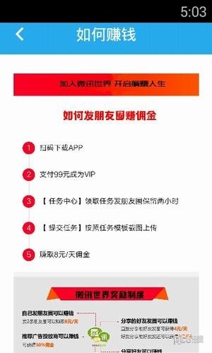 微讯世界是一款营销软件,你只需要出租你的朋友圈就可以赚钱,方式非常新颖,平台中提供了丰富的任务操作简单无需费用收取,快速赚钱资金提现到账速度快任务内容主要以商品广告,招商广告为主。佣金当天发放,提现24小时内可到账,提现目前支持支付宝和银行卡提现。