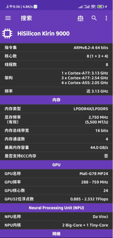 详细的参数,拿国产之光麒麟9000的参数页截图举例