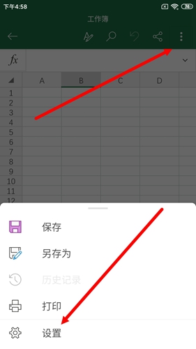 我们打开表格,然后点击右上角的三个点的选项,呼出功能菜单,然后点击里面的【设置】。