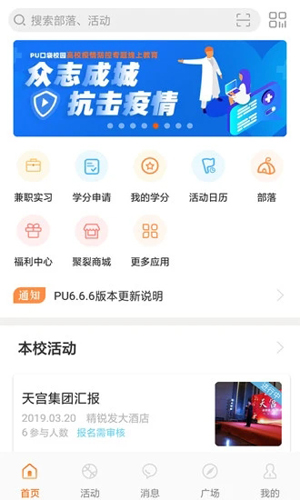 PU口袋校园(PocketUni)是一款针对高校大学生的实名制互动网络平台,由苏州天宫信息技术有限公司自主开发,通过该APP参与活动就可以获得第二课堂的学分,专注于为高校学生的成长提供 “素质培养”以及“职业培养”的服务和支撑,帮助学生完成从“学生族”到“合格社会人”的转化。app最新版是专为大学生打造的校园服务软件,目前成功在北京、上海、广东、云南、青海、陕西、甘肃、宁夏、安徽等20省市高校开展推广、对接,相信未来会有越来越多的高校接入!