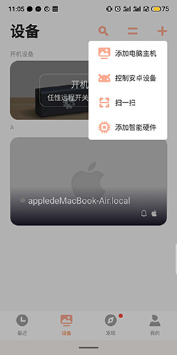 2、选择底端“设备”选项,点击右上角的“+”,可以选择添加电脑主机、控制安卓设备或者添加智能硬件。