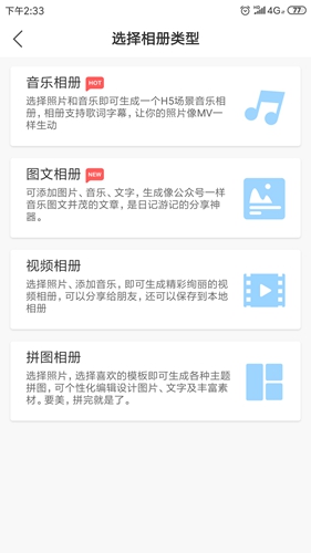音乐相册的制作还是比较简单的,我们进入app以后就可以在主界面看到一个明晃晃的创建相册,点击这个选项之后我们就能看到制作音乐相册的选项了。