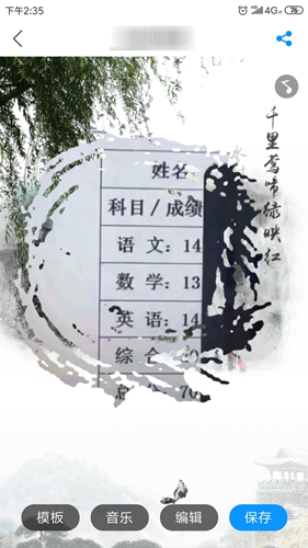 模板的话就是这个相册的播放方式,音乐可以选择我们喜欢的音乐加入,然后编辑点编辑可以添加更多的照片,并在这些照片后面输入相应的字母,甚至还能播放弹幕,全部编辑好后点击保存我们的音乐相册就做好了。