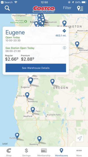4.Warehouse 会显示你附近的Costco点的营业时间以及这家店的油价,非常详细,对于开长途旅游的小伙伴是不是很实用,可以安排在哪个Costco加油比较划算。