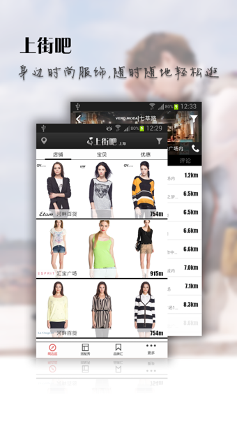 上街吧APP是一款专注于线上逛街购物的应用,它集合了城市的服装新品的展示,对偶尔犯懒得妹纸来说,这个很不错。身边各大时尚服饰卖场和品牌门店信息、最新款单品信息、优惠促销信息随时随地轻松掌握,“上街吧”手机应用已成为中国数以百万都市时尚女性逛街购物的手机必备导购利器,玩转“上街吧”,让您轻轻松松逛街,开开心心购物,你甚至可以在网上逛街买衣服了~还等什么赶紧下载吧!