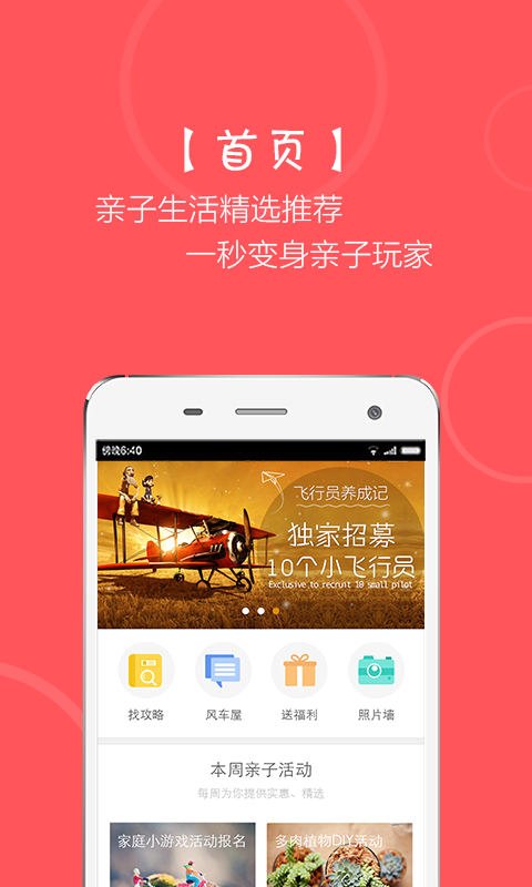 纸风车APP是一款针对亲子打造的社区应用,专注于亲子生活方式创新的S2C服务平台。纸风车APP是以城市亲子为核心,通过推荐城市亲子去处和提供用户亲子活动体验,为用户提供最萌最潮的亲子装指南,最美最营养的亲子食谱,亲子游周边游攻略,让你一秒变身又酷又炫的百科爸妈。