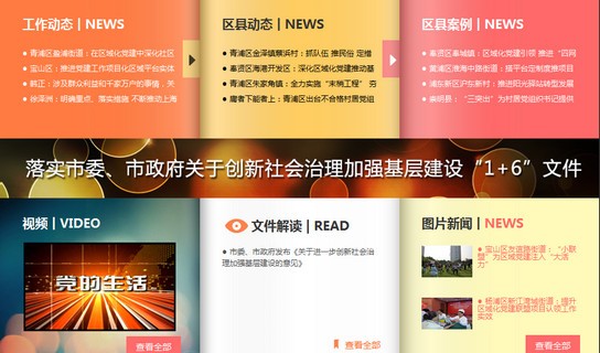 网站从“党建”、“农村党建”、“企业文化建设”、“两新党建”、“高校党建”、“行政事业单位党建工作”、“学全国各地其长”等多方面多方位报导当地和国内其它省份的党建工作信息,还结合上海市党建工作网站连动网,立即传送31家党建工作连动网站的实时动态信息。