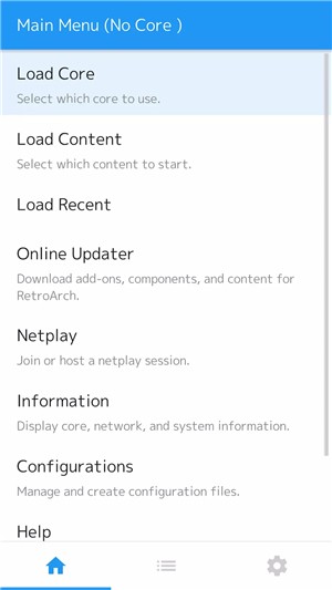 不要搞错了,其实这就是应用的初始页面,只不过载入了一个核心后,标题蓝条后面出现了核心的名字(在括号内),另外多了第一项条目 Quick Menu,其他都和以前是一样的,Quick Menu 暂时先不用,稍后介绍。现在我们就可以进入游戏了,进入游戏的方法是在初始页面点击 Load Content。