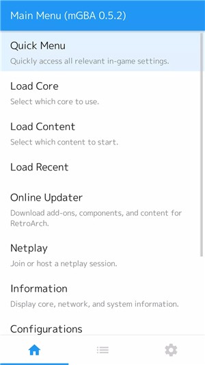 如图所示,这些是已经下载好的核心。我们点击 mGBA 核心后,界面变成了这样: