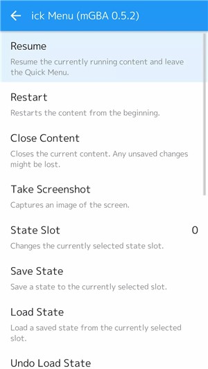 现在介绍从游戏中退到应用界面的方法,有没有看到上面那张图里上方有一排按钮?点击中间那个 RetroArch 徽标(竖屏中要按住才行),你就会退到 Quick Menu 中。