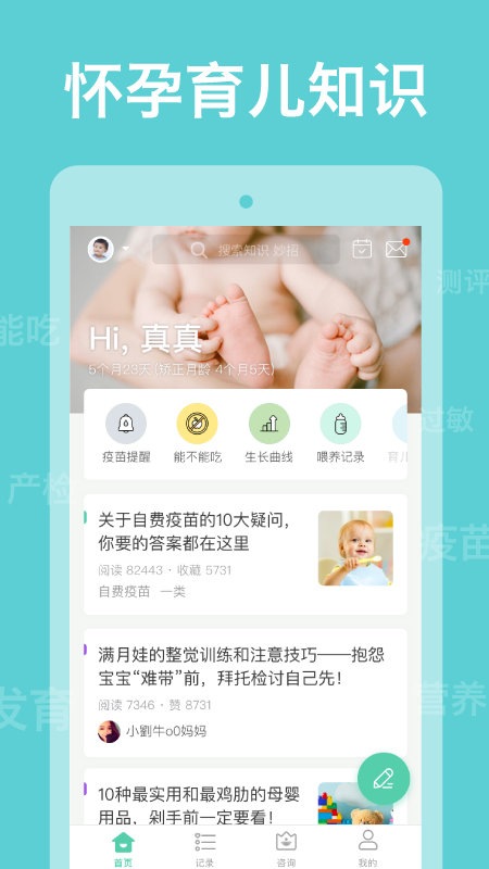 更有详尽的知识库便捷怀孕期分娩后的家长们进行全面访问与知识查看。育儿知识全知道,潮妈助手好管家。