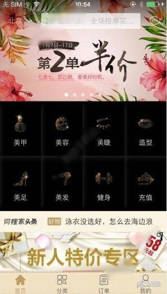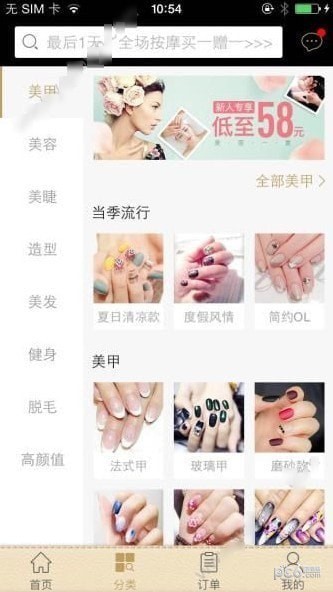在分类里,你可以看的各种分类,美甲,美容,美睫,造型,美足,美发,健身,点进去可以看到当季的流行元素!