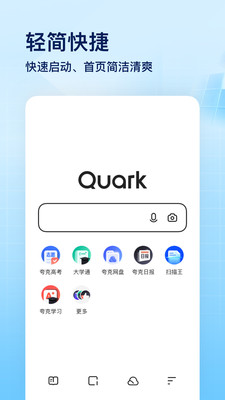 夸克,智能搜索的先行者,提供极速精准的搜索体验、大空间不限速网盘服务、AI相机高清扫描工具。搜索,就该更好的!1.内核:基于Chromium自主订制的Quarkium内核,速度更快更流畅。