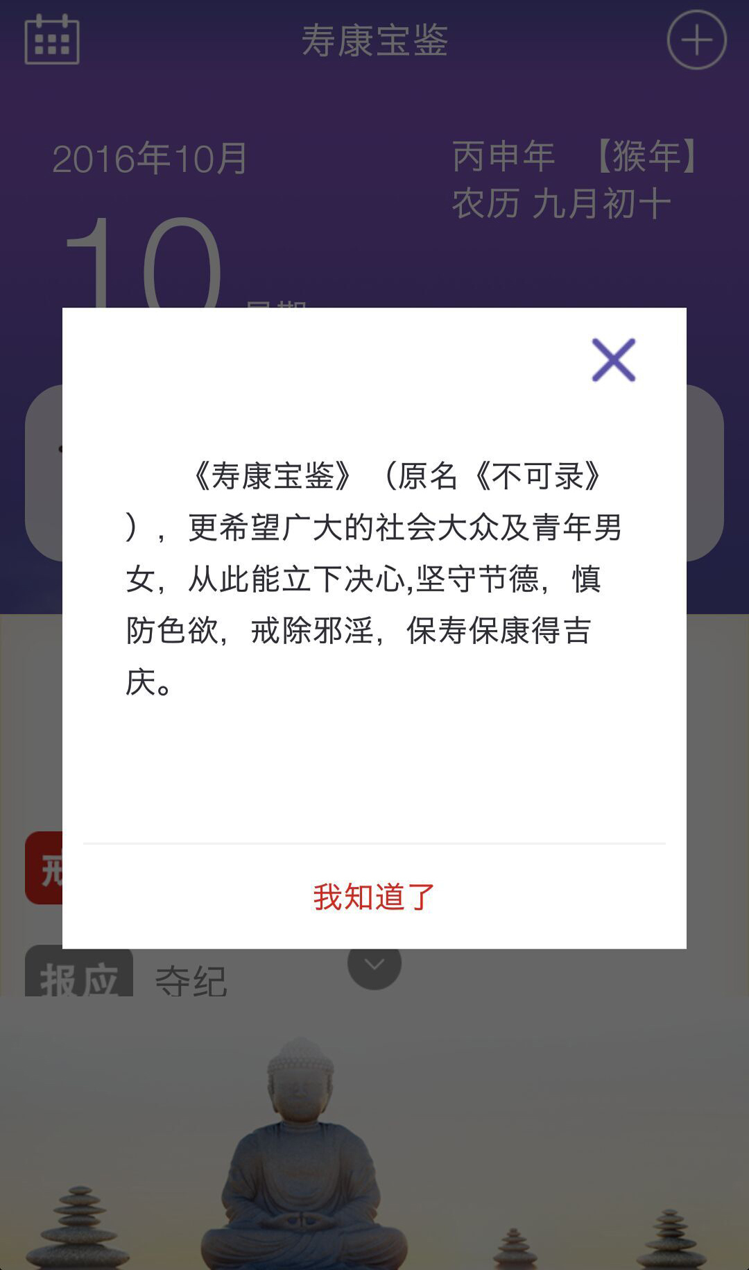 寿康宝鉴APP是一款生活服务应用,是寿康宝鉴日历的手机端。包括寿康宝鉴所有戒期信息:二分日、二至日、冬至、冬至后庚辛及第三戌日、三元日、四立日、四离日、四绝日、二社日、三伏日、玄日、晦日、每月三辛日、甲子日、庚申日、丙丁日、毁败日、十恶大败日、阴错日、阳错日以及二百二十五日农历戒期。另外寿康宝鉴app不但具有日历工具,还提供宜忌事件和贴心的提醒服务。