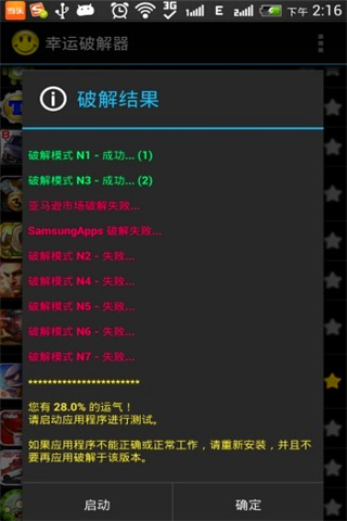 4、点击“应用”以后,程序会自动进行破解,根据被破解的游戏体积和你的设备性能的不同,此过程将消耗30秒到2分钟不等,请耐心等待。破解完之后会弹出下图所示图片,一般情况下只要运气不是0%,都是可以成功破解的,赶快点击“启动”试试看吧!