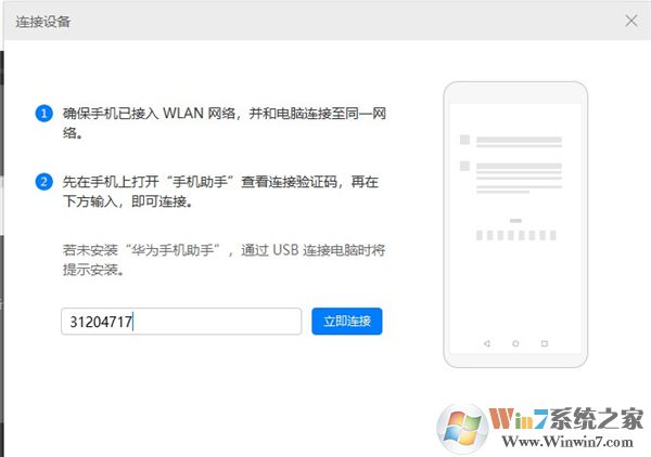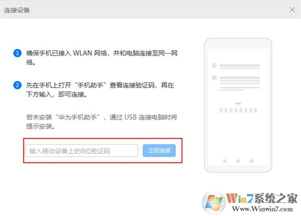 先在手机上打开“手机助手”查看连接验证码,再在下方输入,即可连接。若未安装“华为手机助手”,通过USB连接电脑时将提示安装;