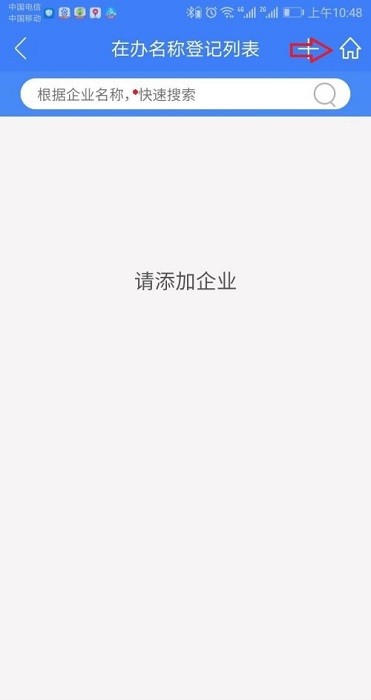 2.点击我的,进入主页,点击名称预约审核,点击右上角如图,进入到企业名称审核。