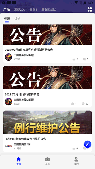 1、打开app,进入首页就可以看到三国游戏各大官方发布的游戏资讯以及福利。