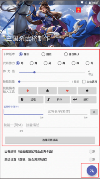 1、打开工具,选择卡牌版本、武将势力,设置体力值和数量,输入武将称号、名字以及技能描述等,下面选择武将插画,最后点击右下角的图标。