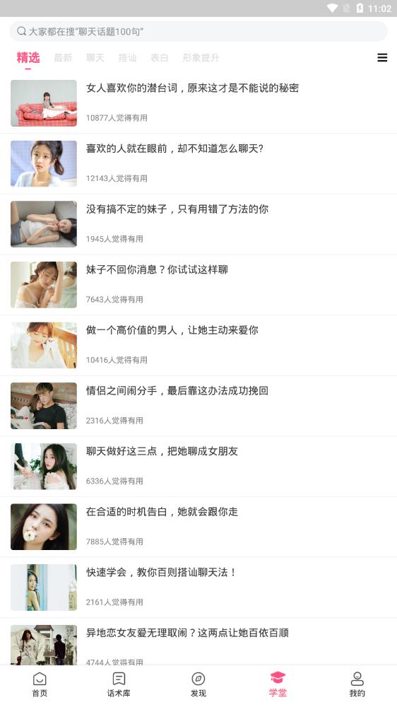 总的这说撩妹聊天话术软件是一款帮助男性用户更容易追求和联系女性的应用程序。它提供了一系列聊天话术和技巧,帮助用户吸引更多女性的眼球,并快速找到自己想交往的人。同时,该应用程序实用易用,使用户更容易上手。
